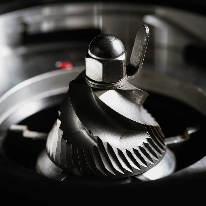 Proiectat pentru o măcinare rapidă și precisă. Sistemul cu transmisie pe curea și rulmenți dubli reduce mișcarea discurilor și transferul de căldură, păstrând aroma bogată a cafelei.